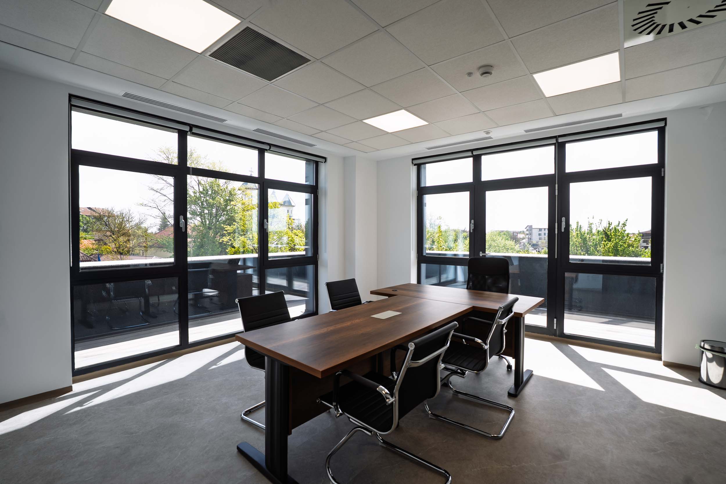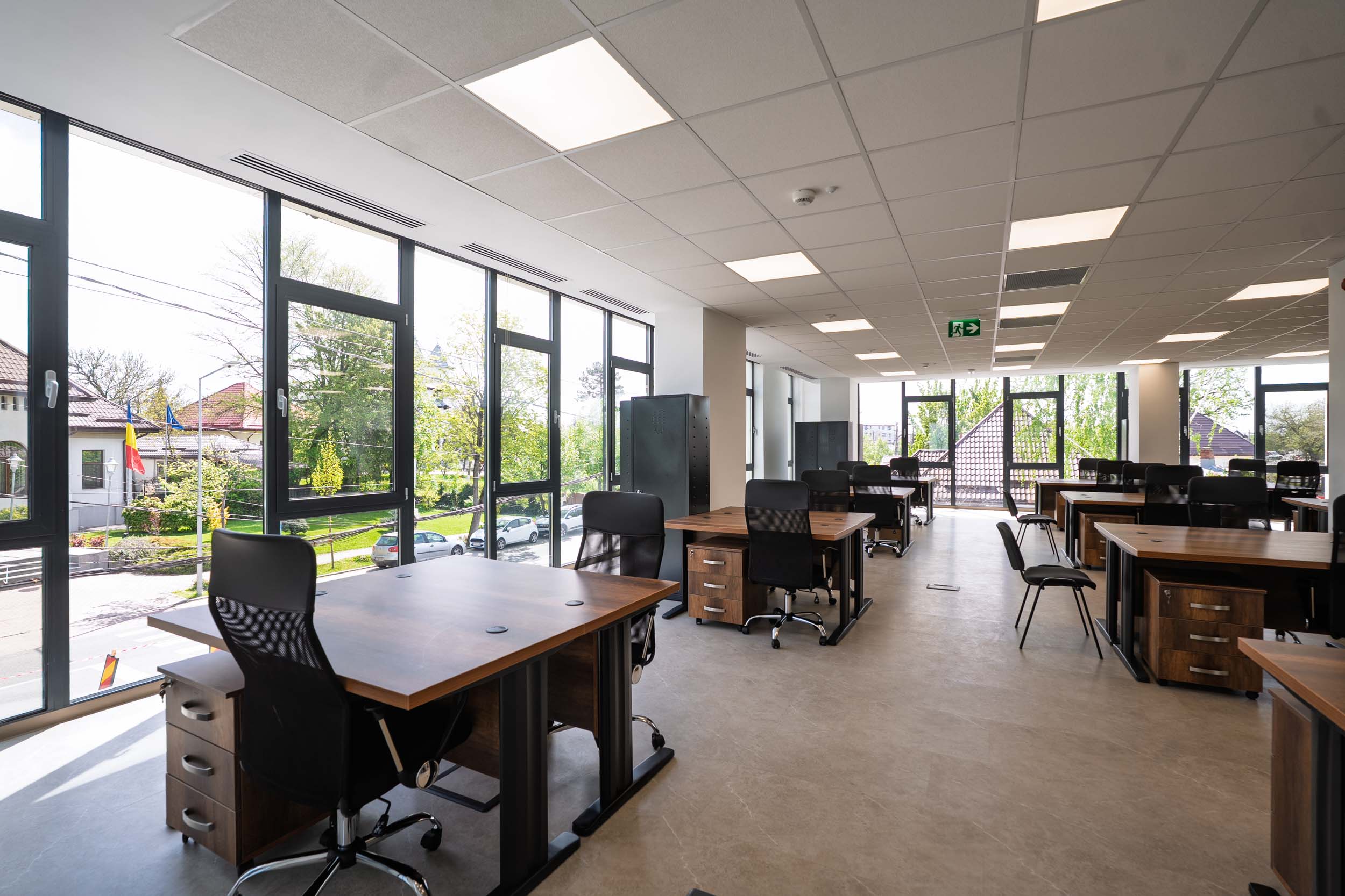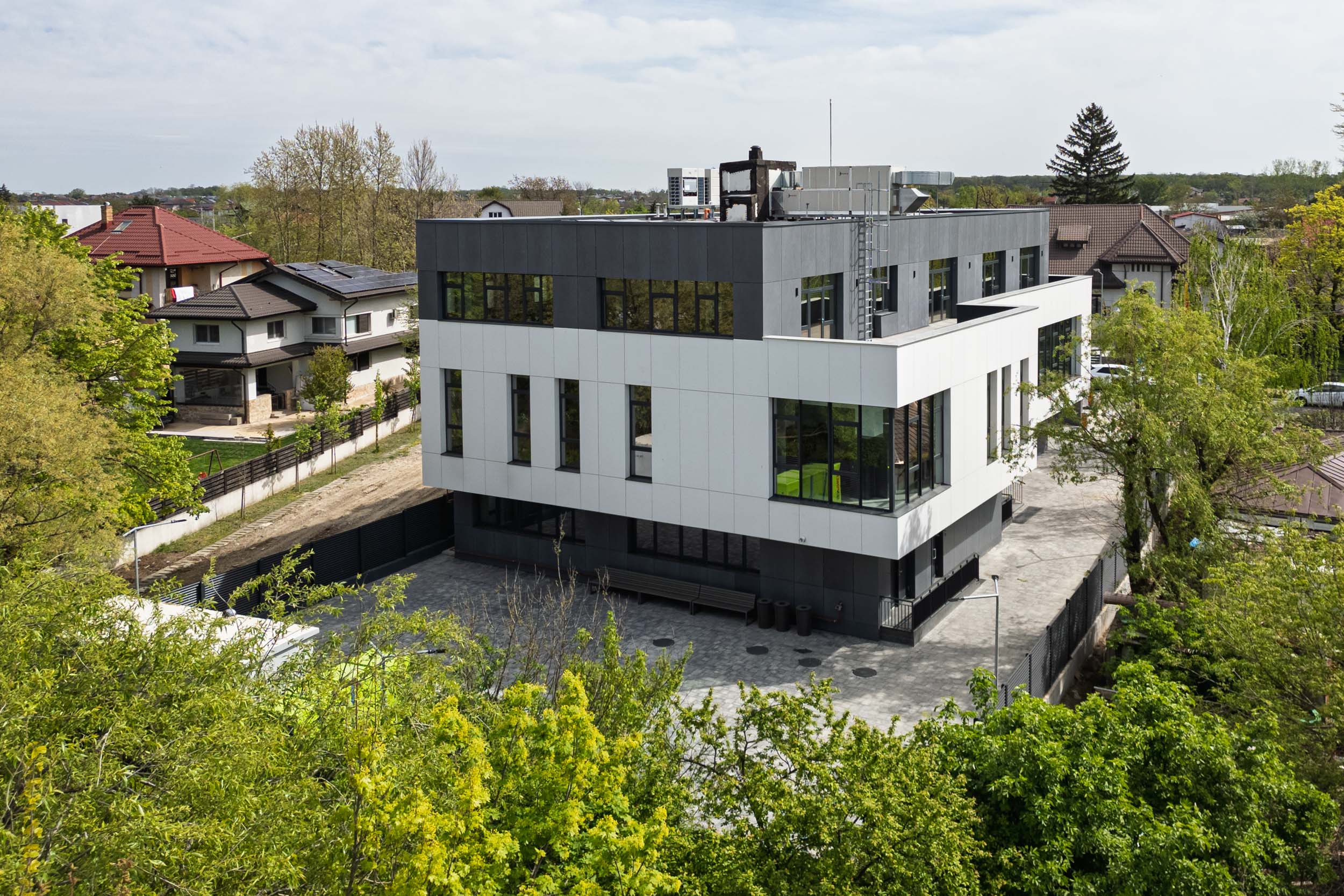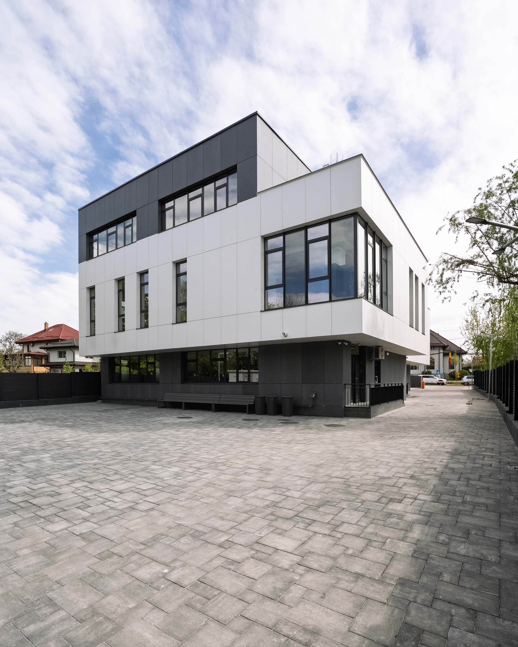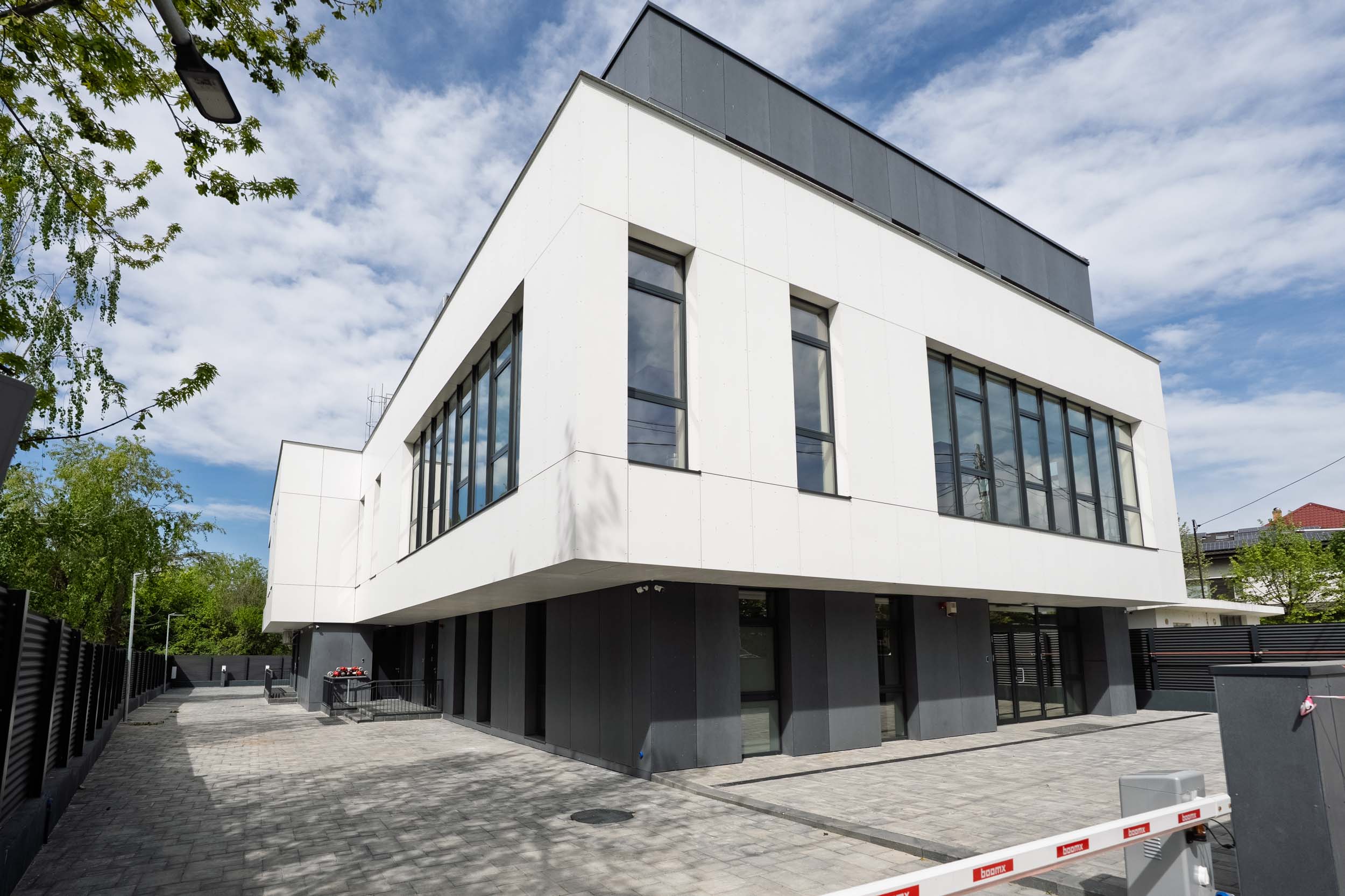 • Arhitectură funcțională: Fațadă ventilată cu placări din fibrociment și tâmplărie de aluminiu cu geamuri antiefracție și control solar.